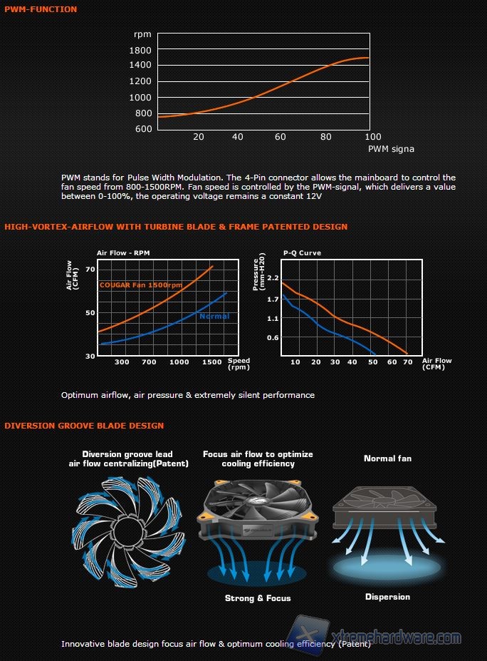 Il flusso d’aria nel caso della Cougar è decisamente elevato se rapportato al rumore, che risulta essere contenuto, senza eccessivi picchi di frequenza. Le performance sono quindi elevate ed il target è l’utente che vuole ridurre le temperature ma senza avere ventole eccessivamente rumorose, quindi l’utilizzo con radiatori è perfetto.