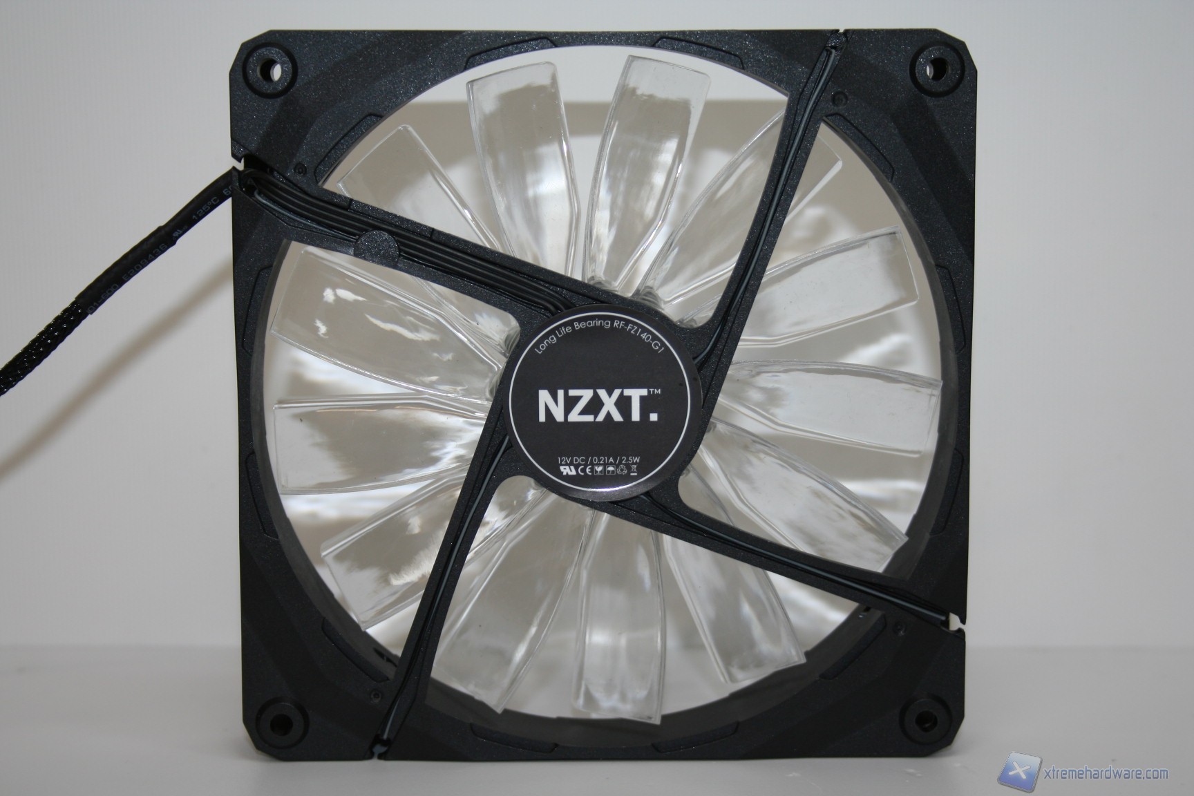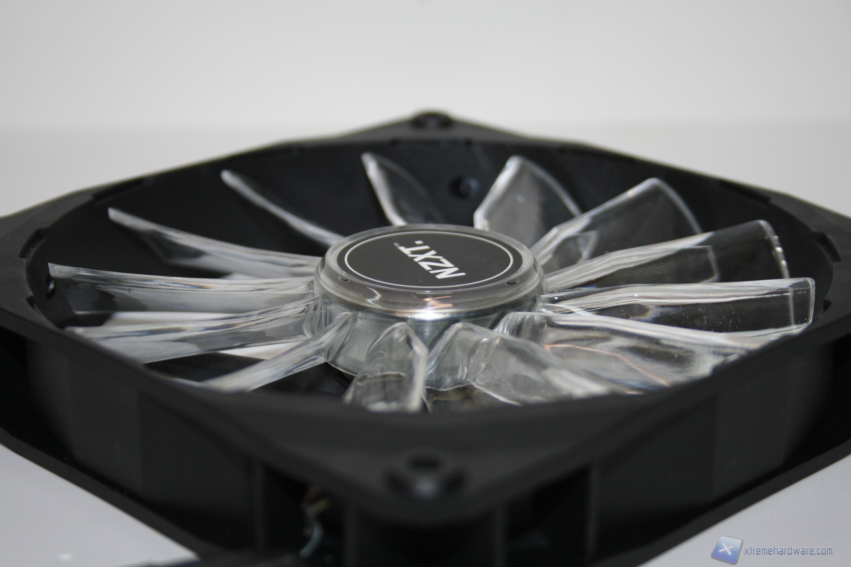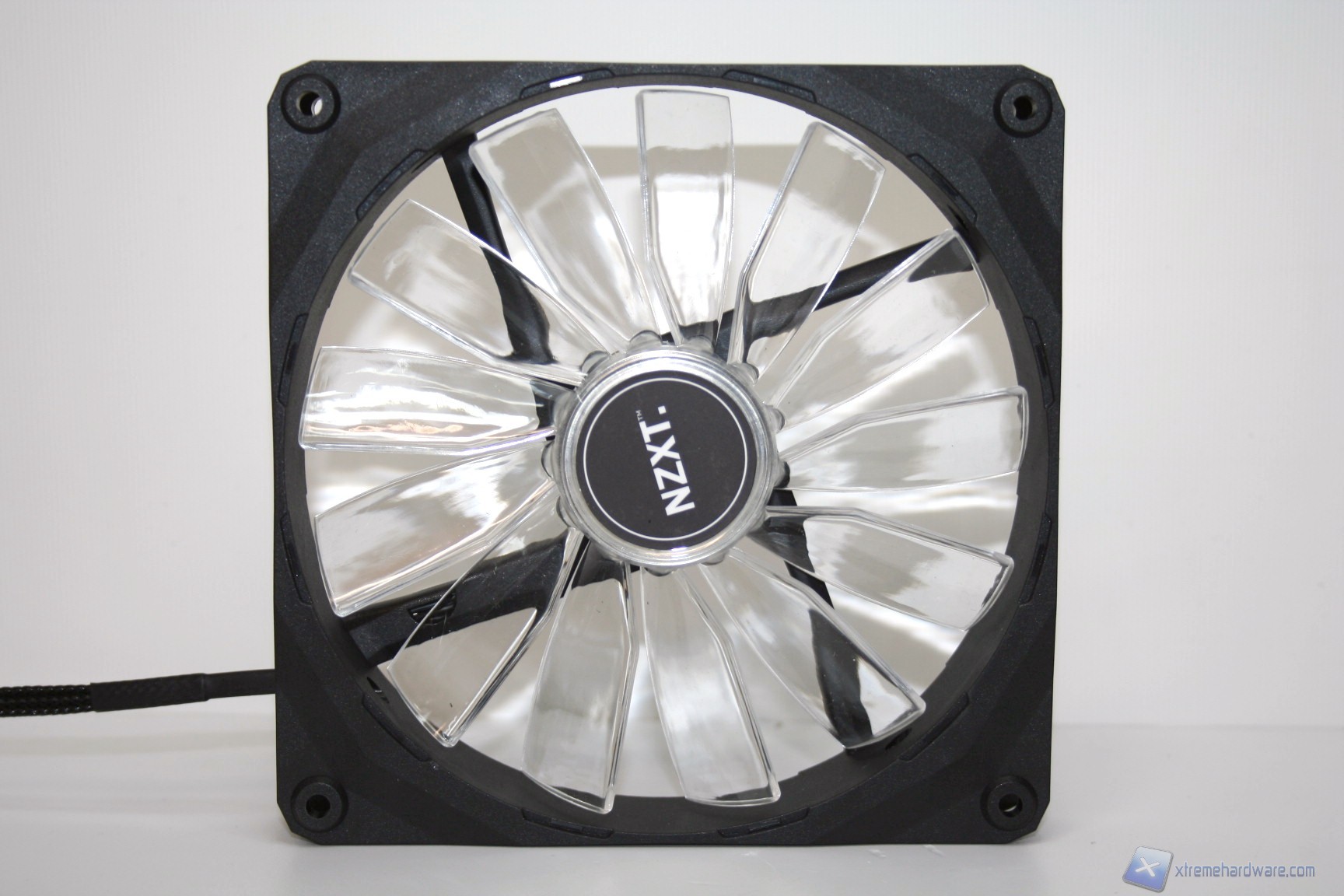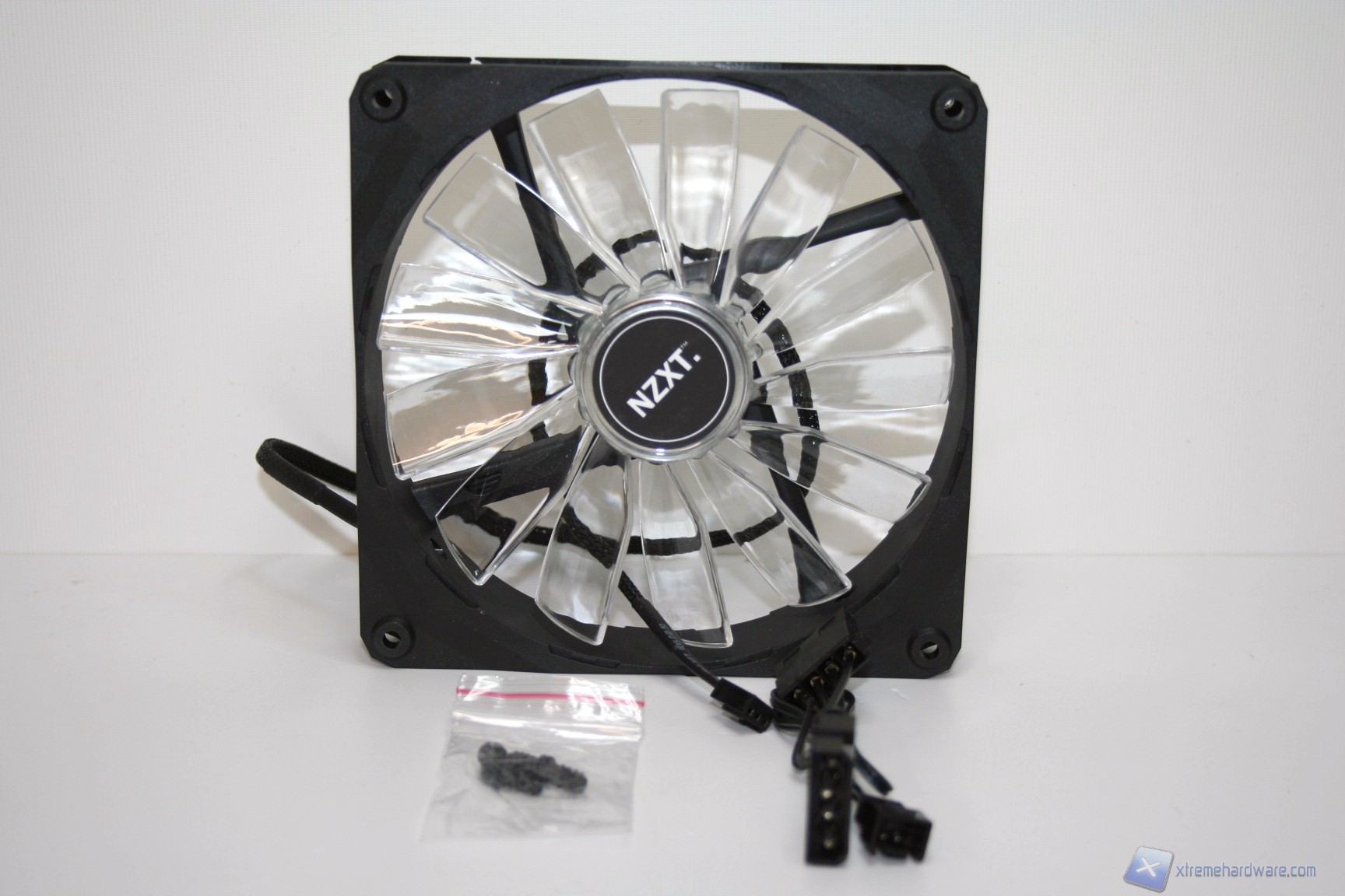 Per quanto concerne il modello NZXT, oltre alle pale trasparenti con quattro LED laterali di colore verde, è caratterizzato da un numero elevato di pale di ventilazione, le quali sono leggermente meno larghe della concorrenza, ed hanno anche una angolazione particolarmente marcata. E’ presente una leggera curvatura verso l’interno del motore e presenta anche un cavo molto lungo ed ottimamente sleevato. La silenziosità è elevata e le performance sono leggermente superiori alla media. Nel bundle viene incluso un adattatore 3PIN – MLX femmina e maschio, assieme alle quattro viti per il montaggio. E’ una dotazione nella media, ma dato il cavo molto lungo non servirà una prolunga.