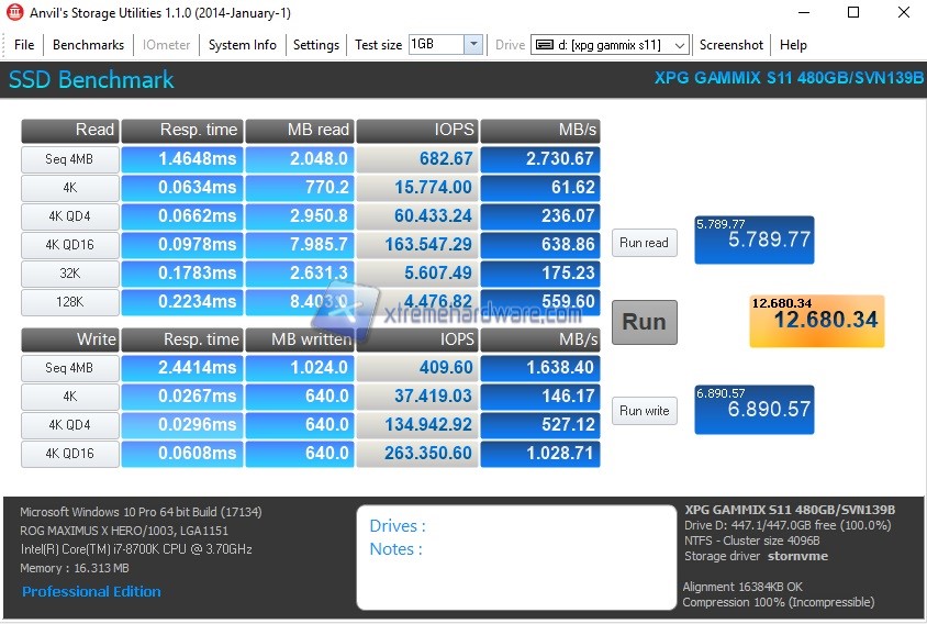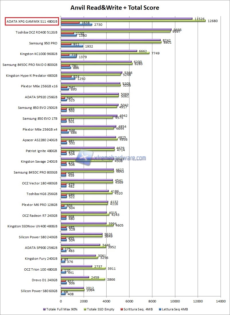 A seguire i grafici con i valori ottenuti dall’ADATA XPG GAMMIX S11 da 480GB: